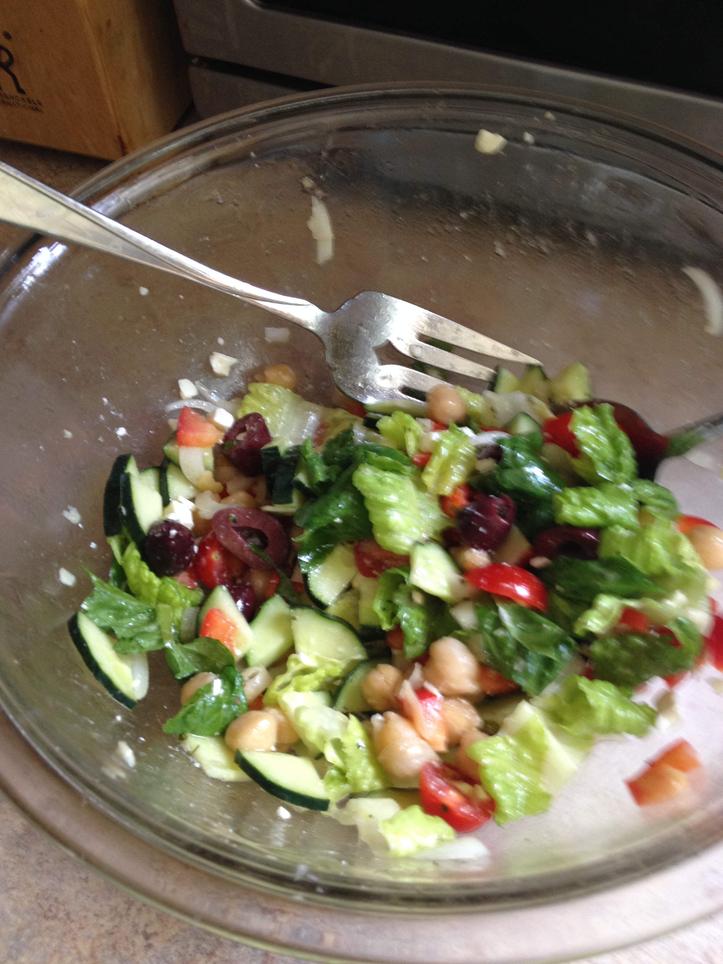 My review: It was delicious!!! It is full of healthy ingredients, from chickpeas, to peppers, cucumbers to tomatoes and I added lots of romaine lettuce. I just love the crunch from the lettuce and the cucumbers. Of course, I put most of the olives to the side and gave them to him, lol and I sprinkled less then the recommended feta cheese but if you like it, you can certainly add more. It was very good and so healthy for you, I will definitely make it again.
